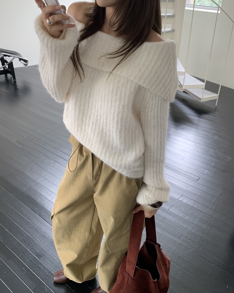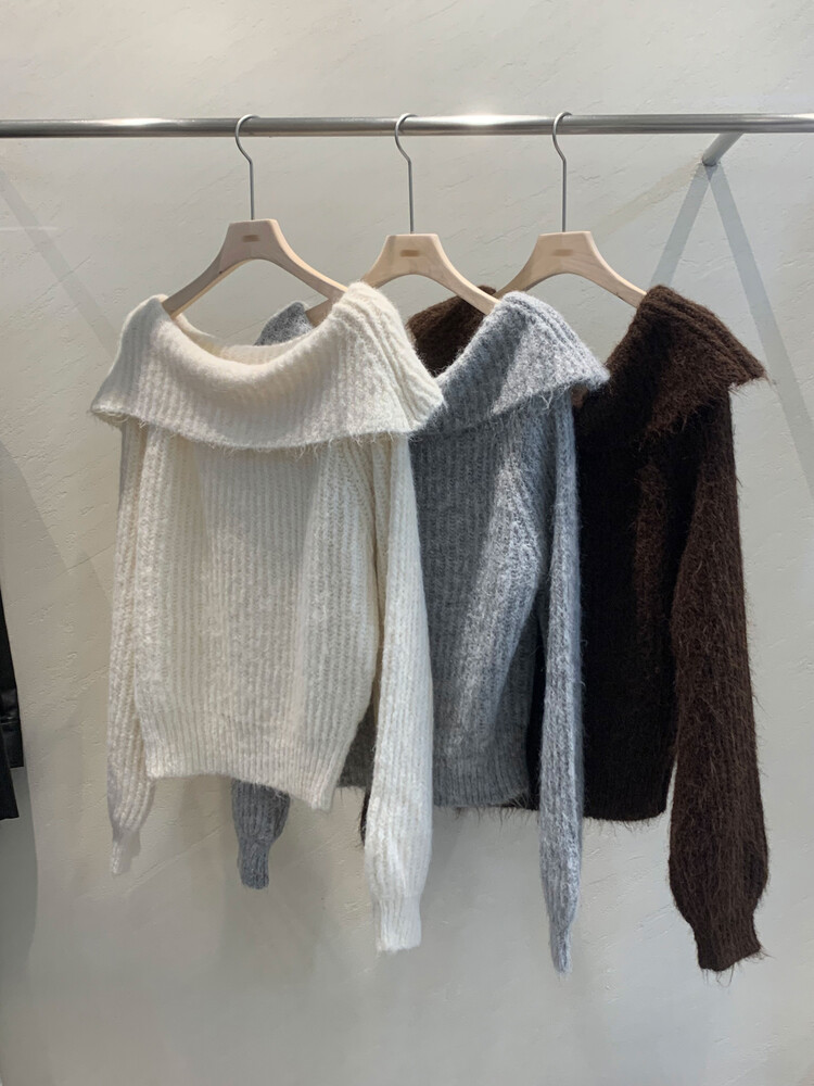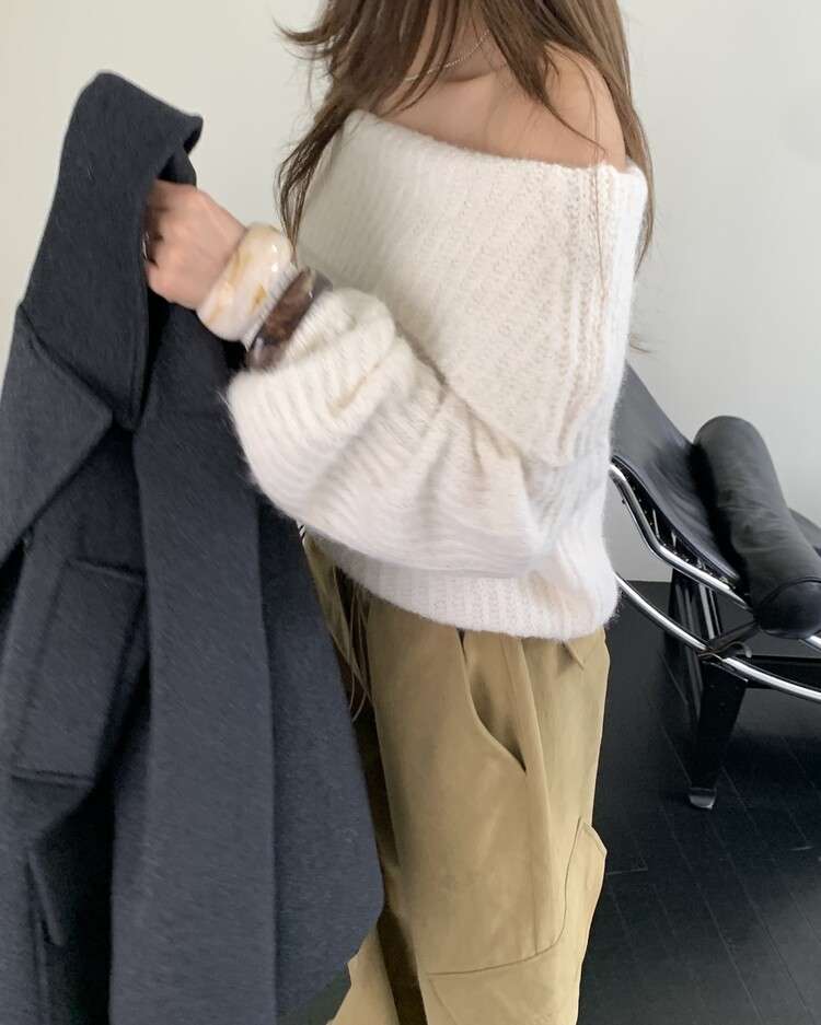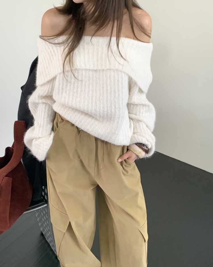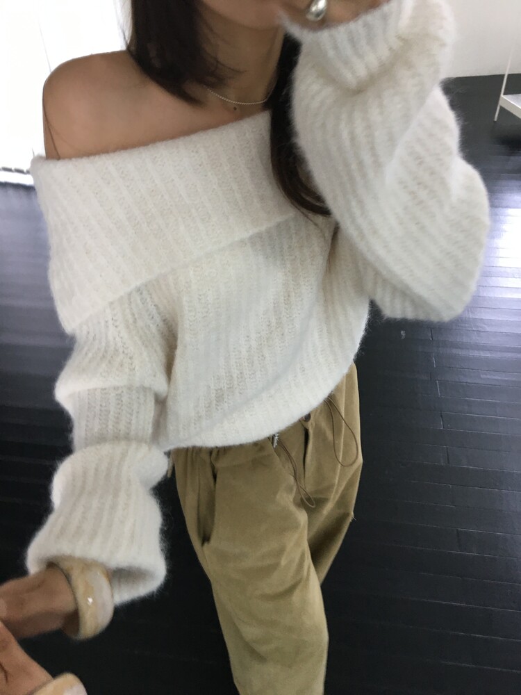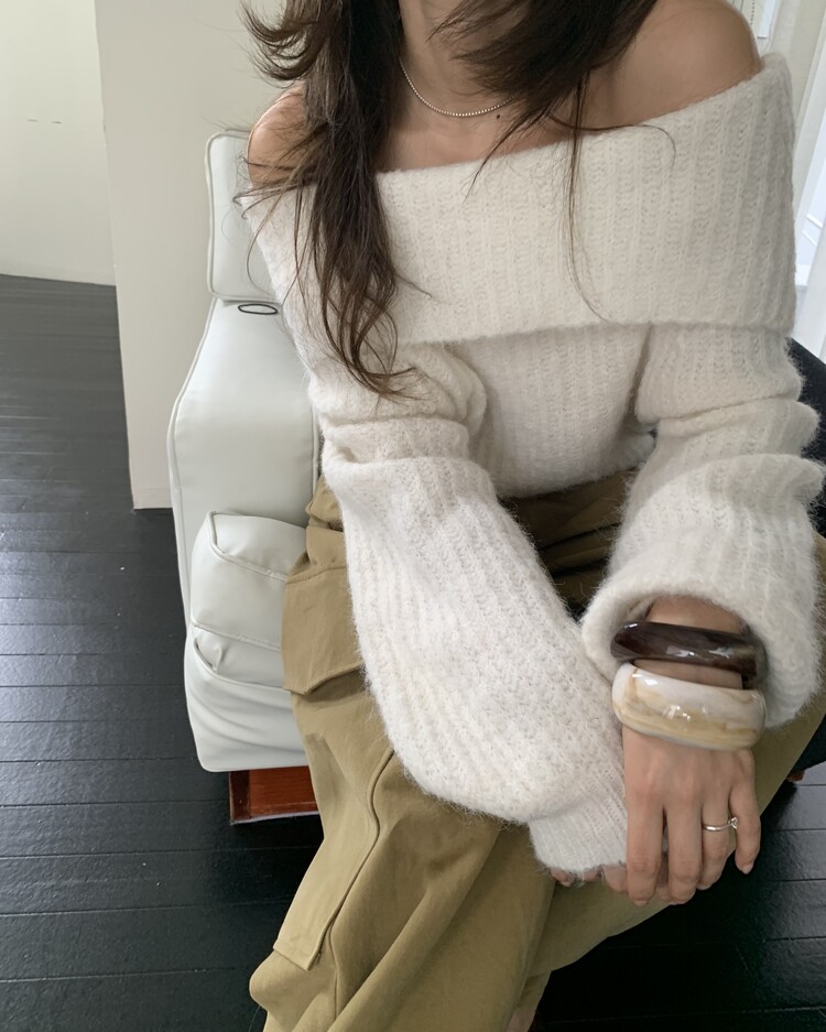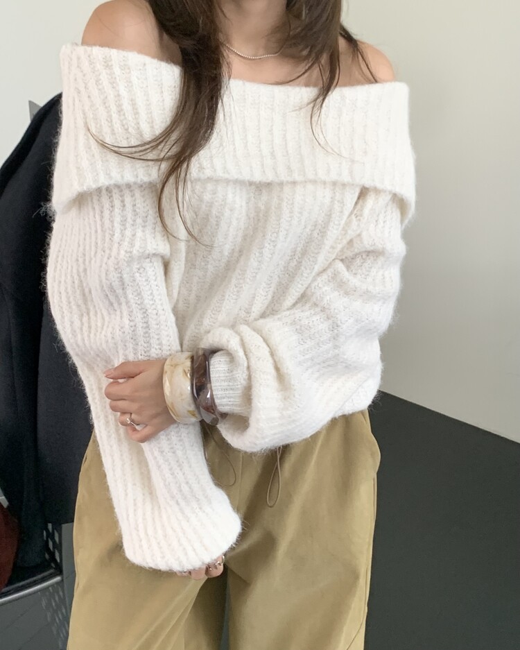 도톰한 소재와 부드러운 터치감이 매력적인 오프숄더 니트입니다.