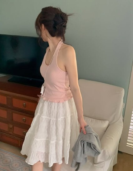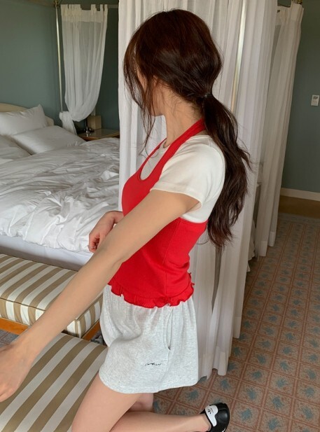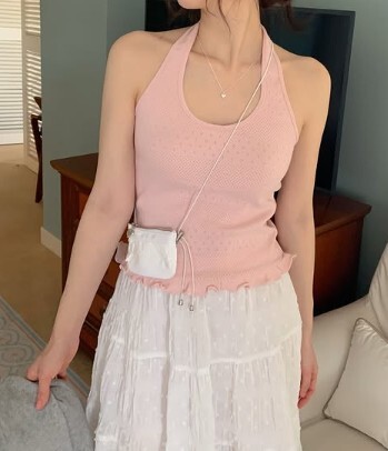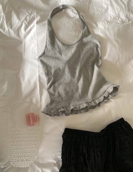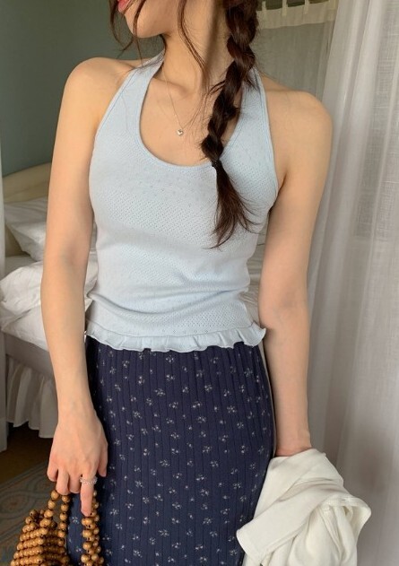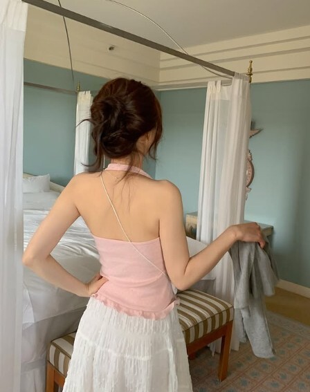 목선을 따라 자연스럽게 감싸는 홀터 디테일로