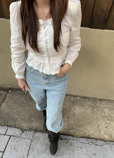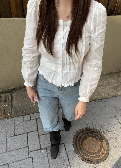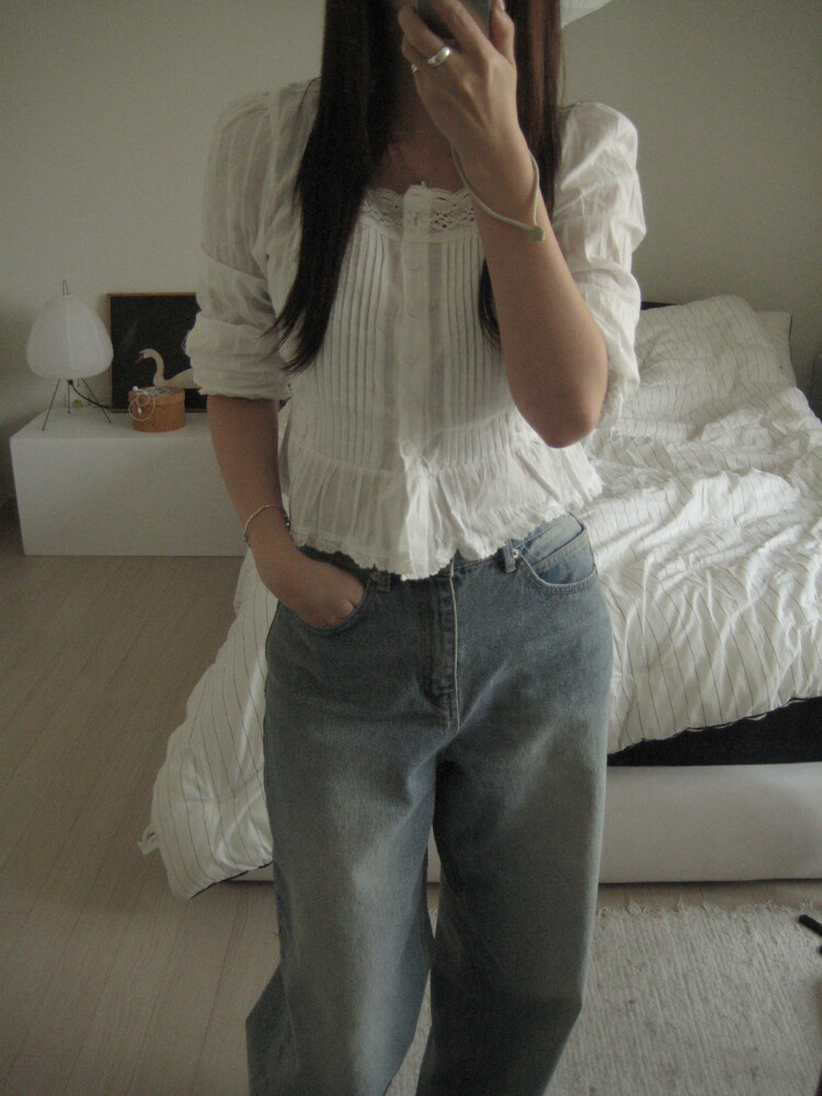 소매 끝과 밑단에도 은은한 레이스 자수가 더해져 밋밋함 없이