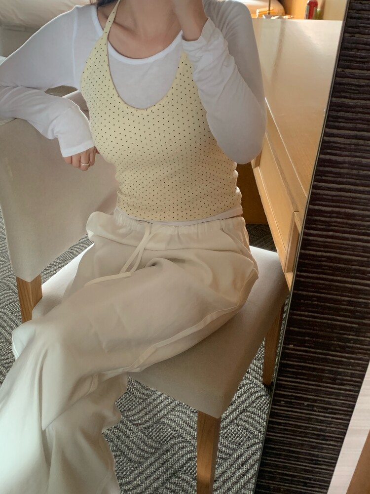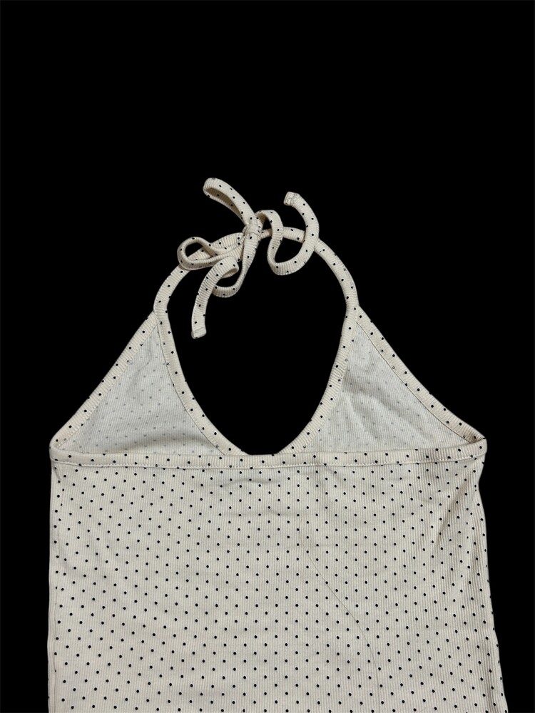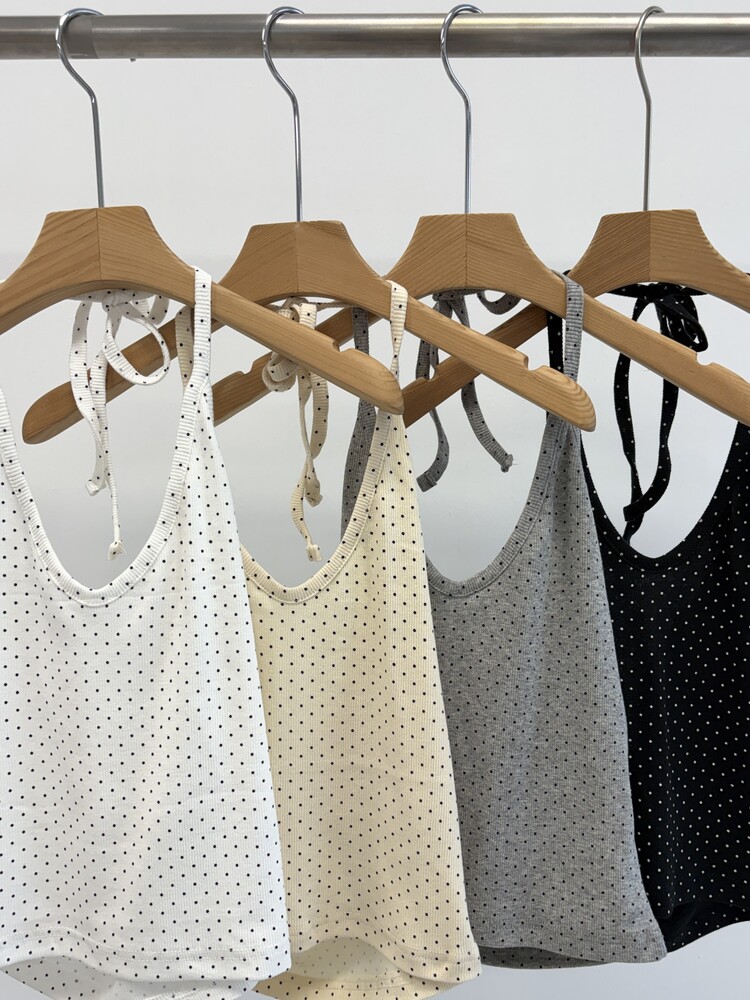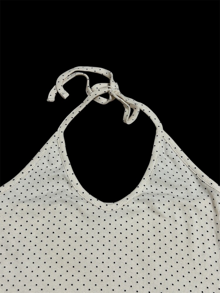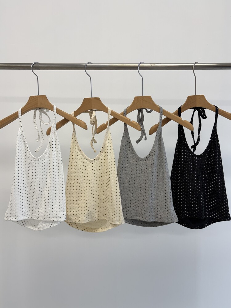 도트패턴과 쇄골라인을 예쁘게 살려주는 홀터넥 디자인으로