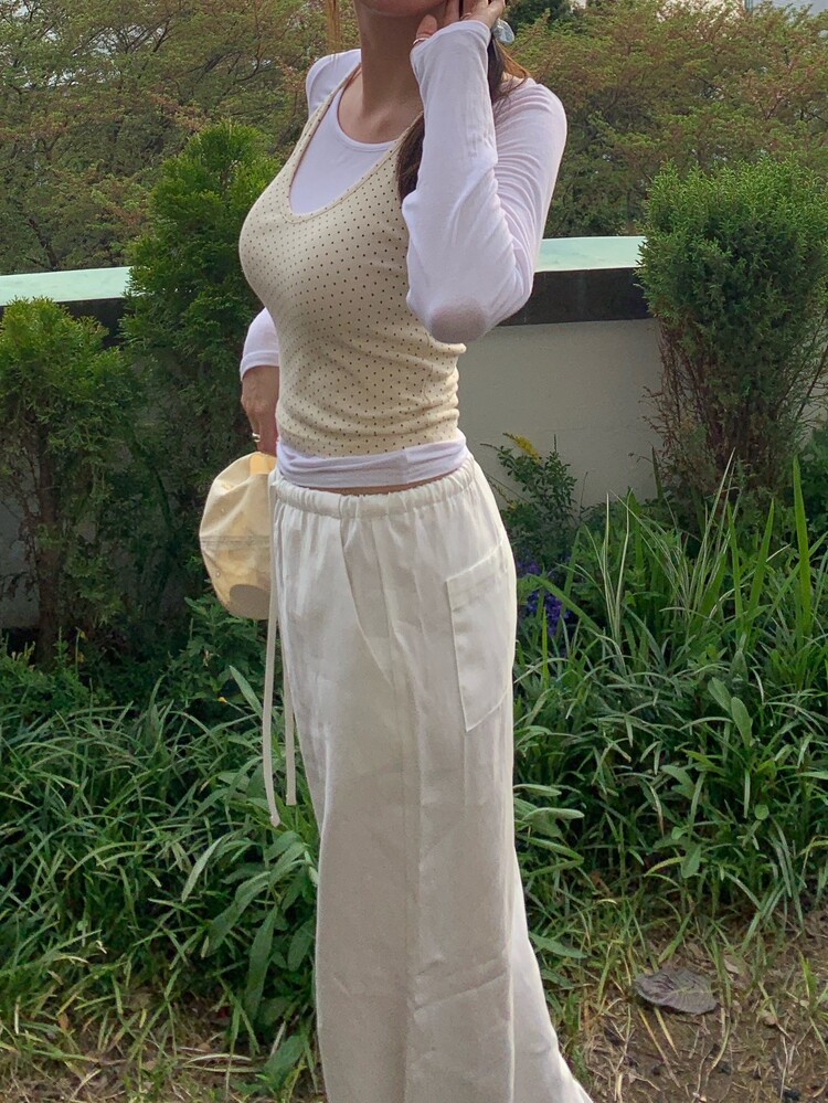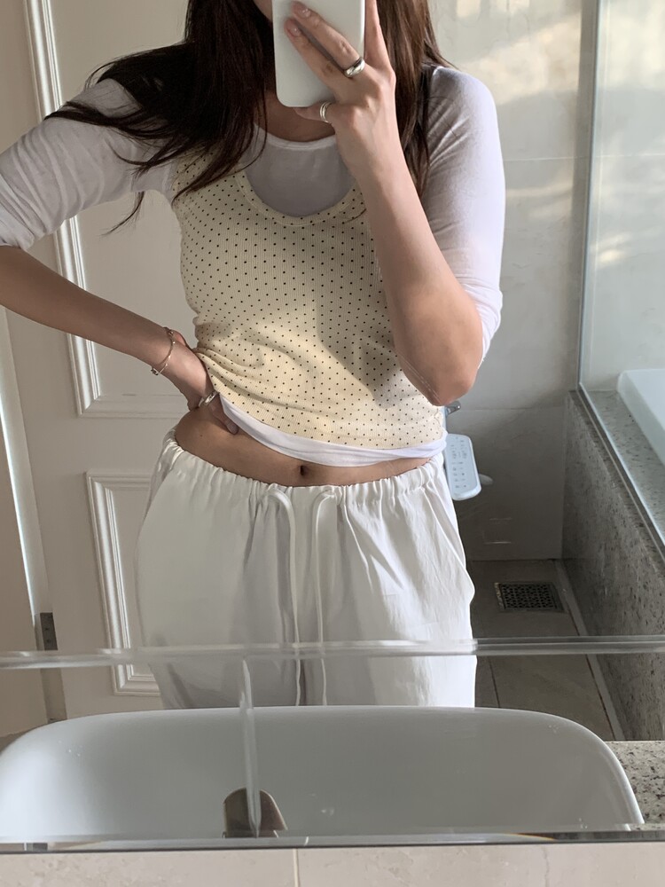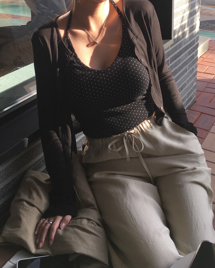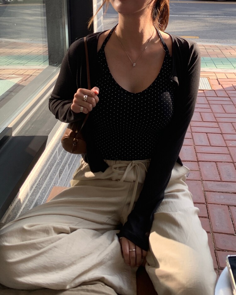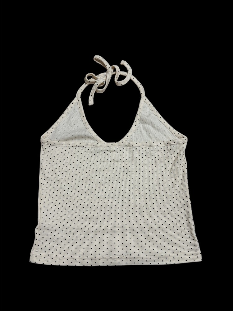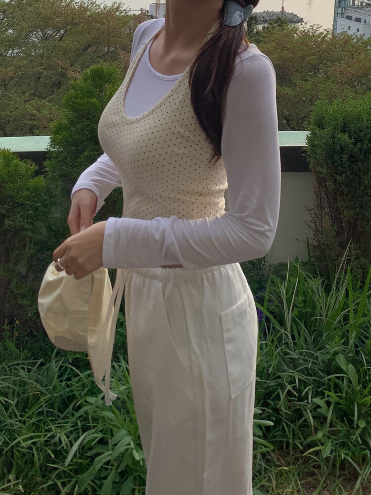 도트패턴과 쇄골라인을 예쁘게 살려주는 홀터넥 디자인으로