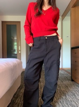트렌디한 크롭 기장감으로 다리라인이 길어보인답니다.