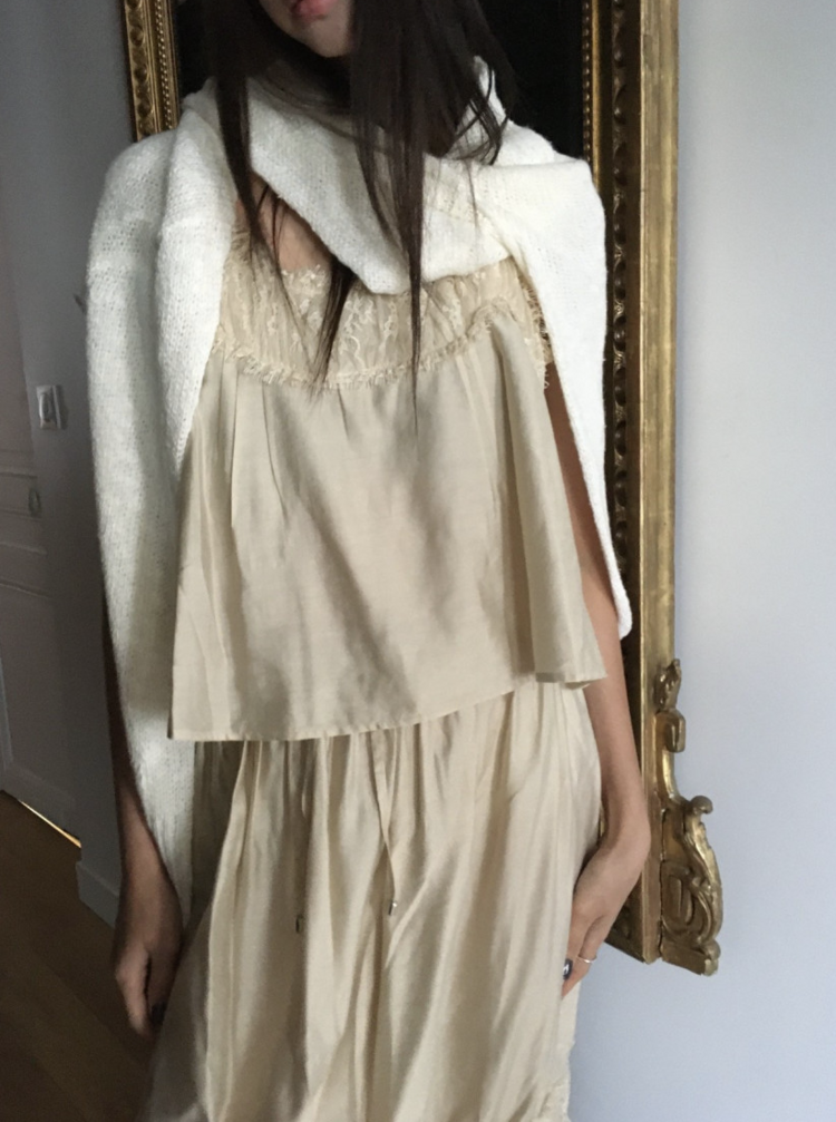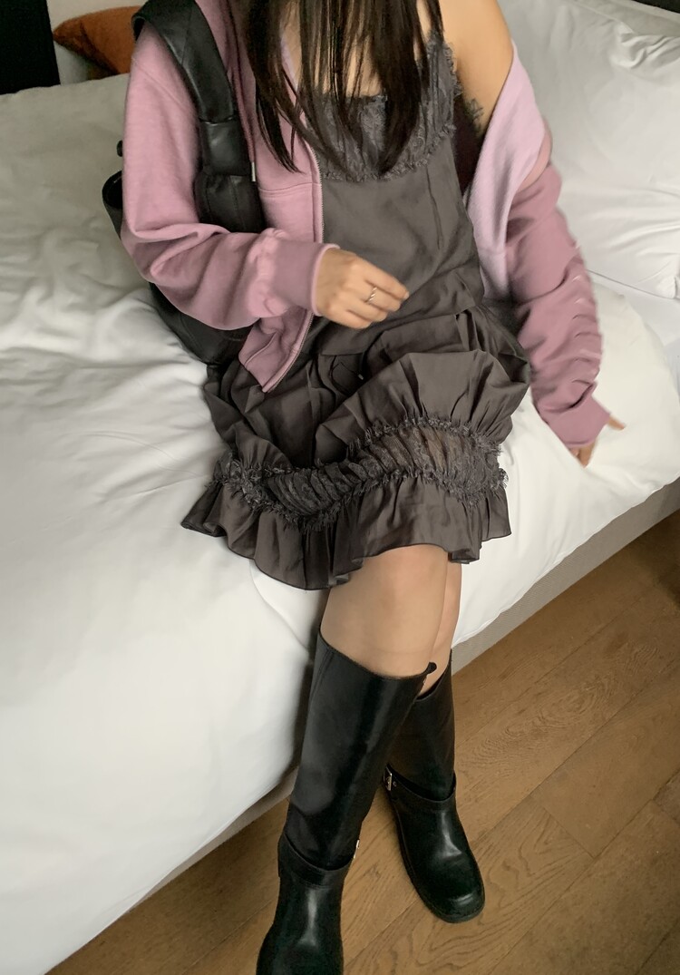 피부가 가볍게 드러나는 레이스 디테일은 텍스처 대비를 살려