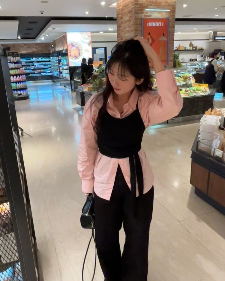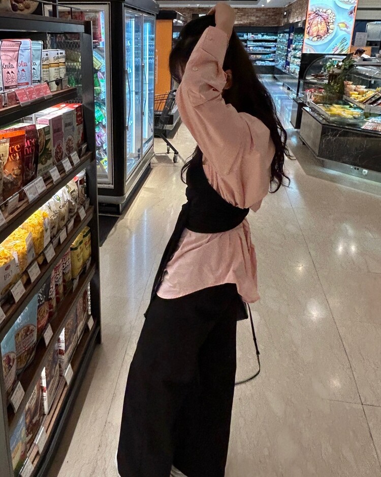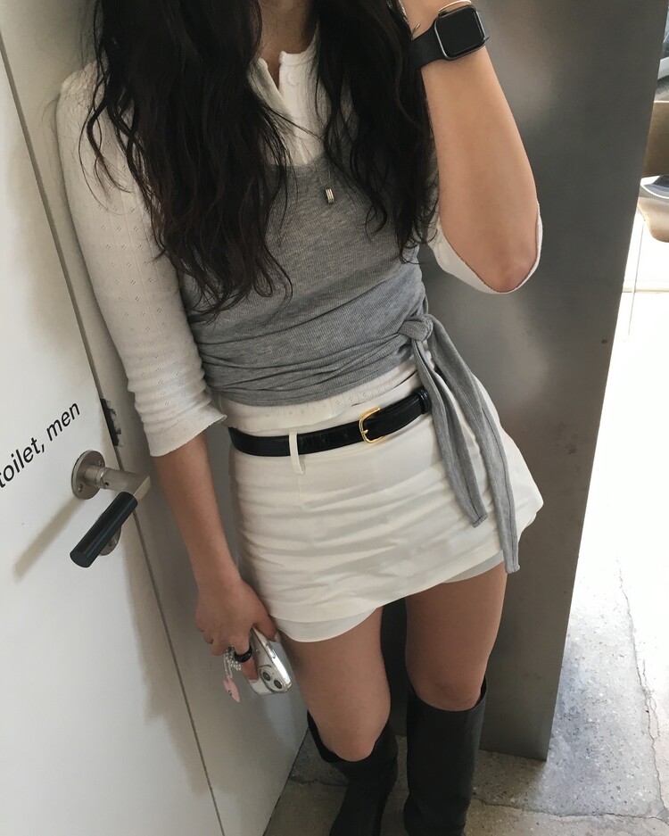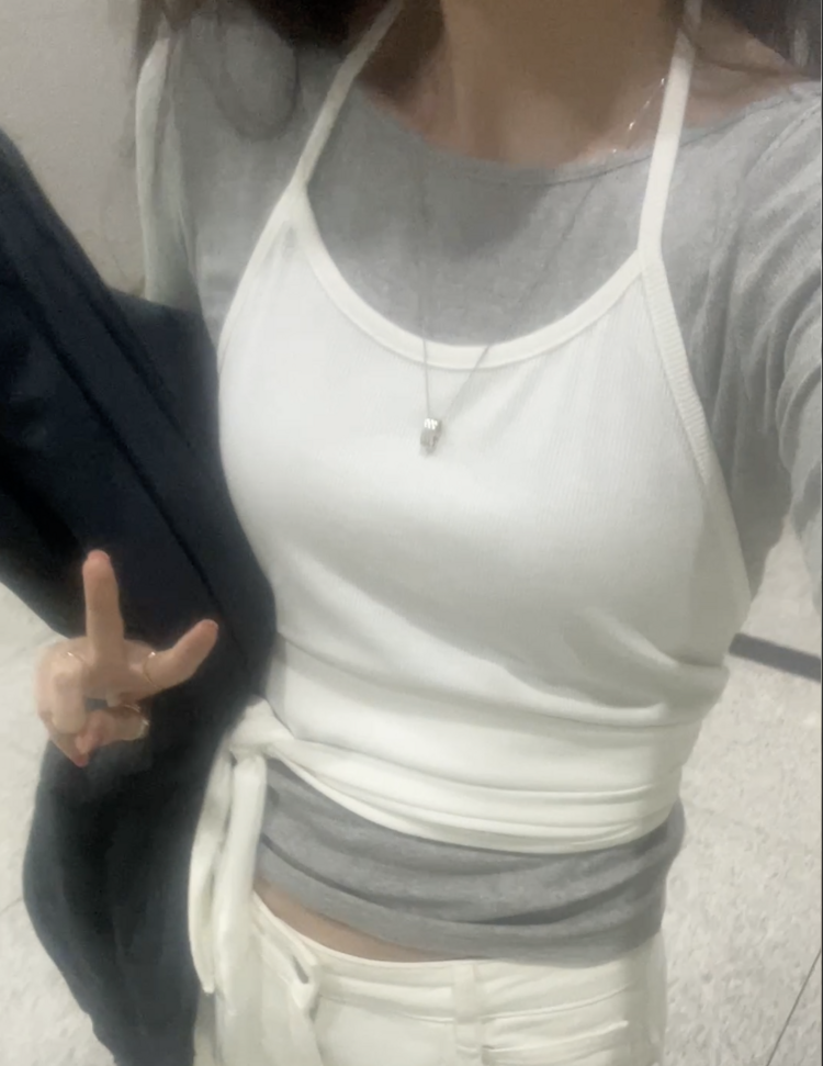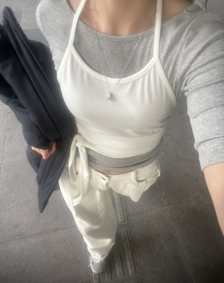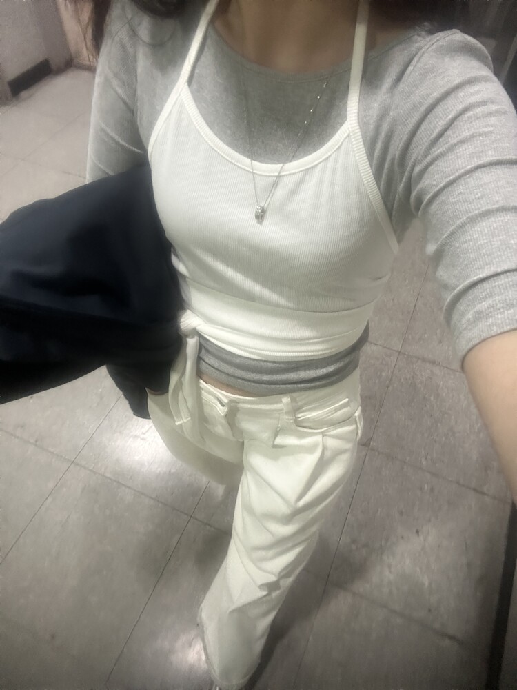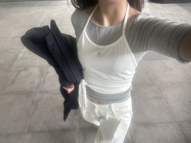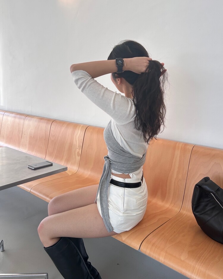 앞으로 가져와 허리라인을 잡아주어 핏감을 잡아줍니다.