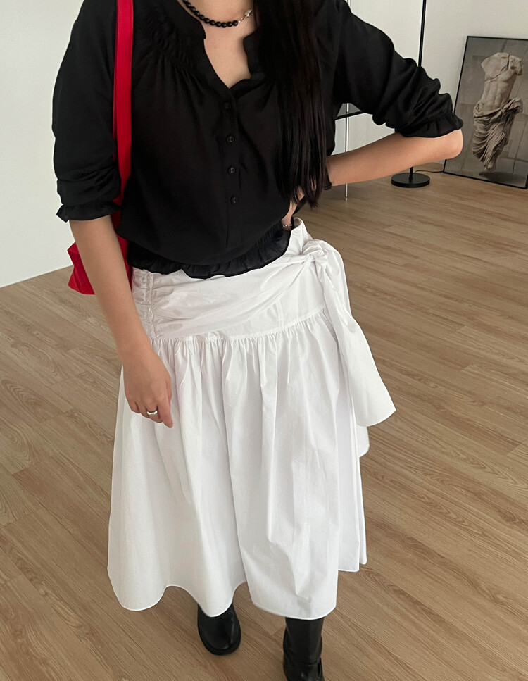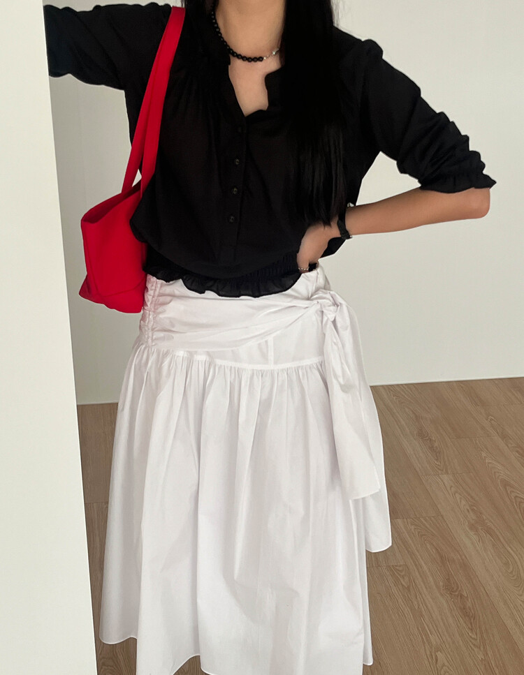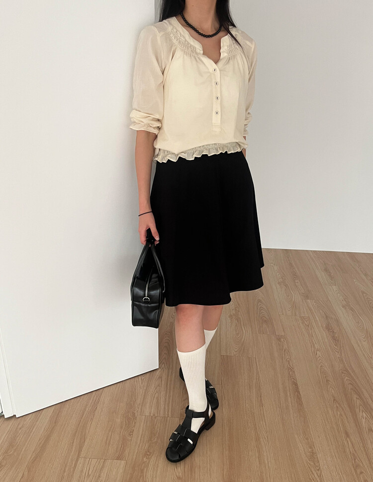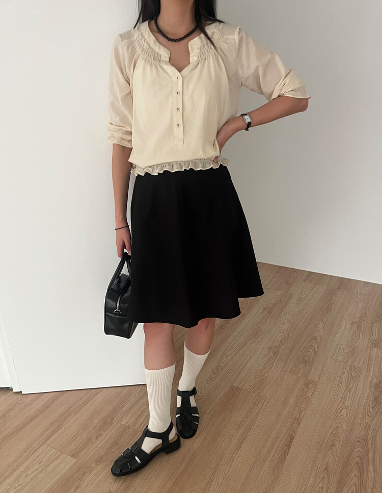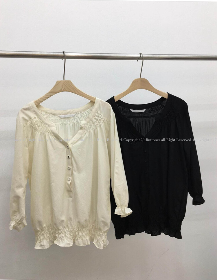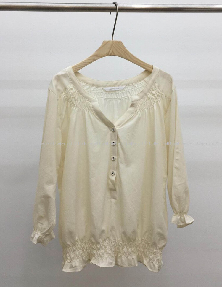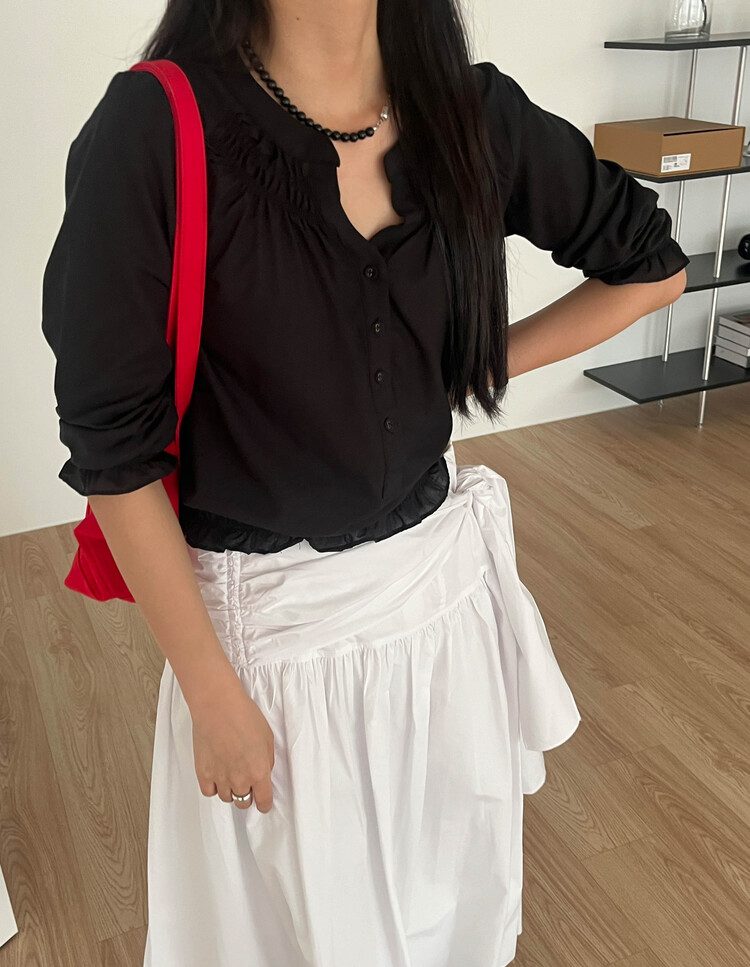 넥라인/소매/밑단부분에 셔링이 들어가 포인트요소가 확실하고