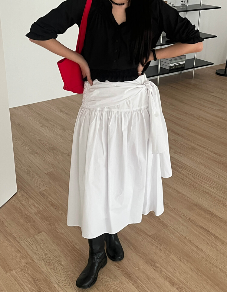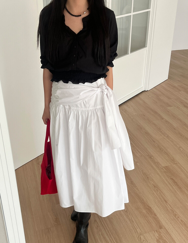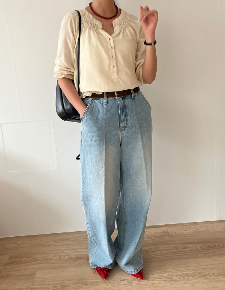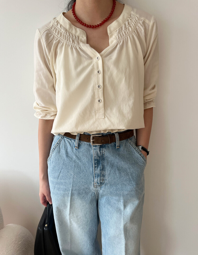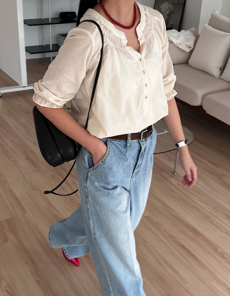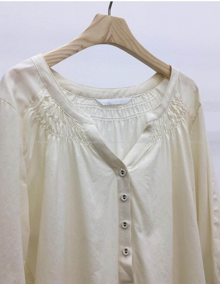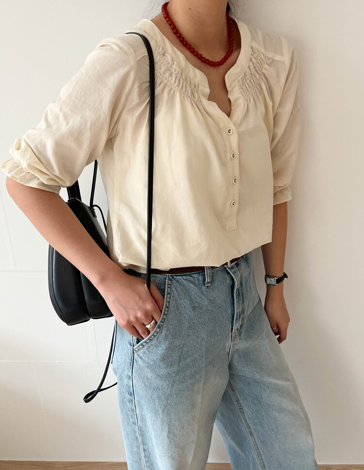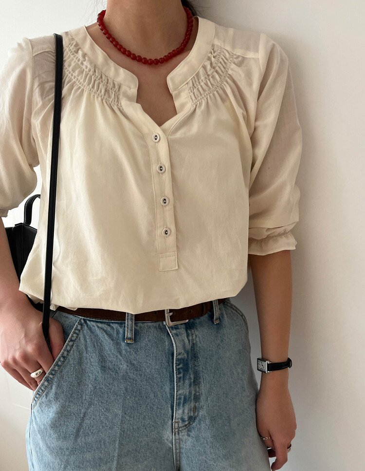 넥라인/소매/밑단부분에 셔링이 들어가 포인트요소가 확실하고